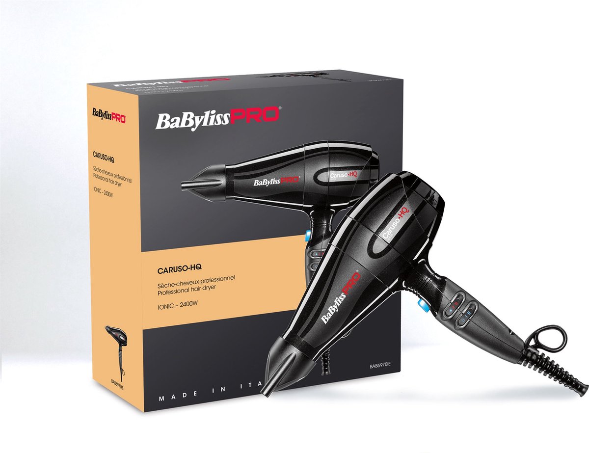 Achieve salon-quality results with the BaBylissPRO Caruso-HQ, a powerful 2400W professional hair dryer made in Italy. Designed for intensive professional use, it delivers exceptional performance with ultra-fast drying, precise styling, and enhanced hair care. Its lightweight and ergonomic design ensures comfort for prolonged use while its advanced ionic technology leaves hair smooth, shiny, and frizz-free.