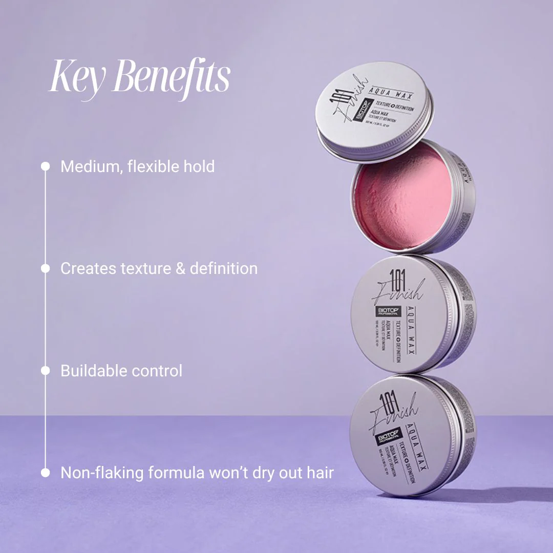 BIOTOP 101 Create Aqua Wax offers medium, flexible hold that shapes hair with natural texture and definition. Its workable formula provides buildable control without stiffness, allowing you to style with precision while maintaining a smooth, non-flaking finish. Ideal for creating lasting styles without drying out hair, this wax delivers professional results with effortless ease.
