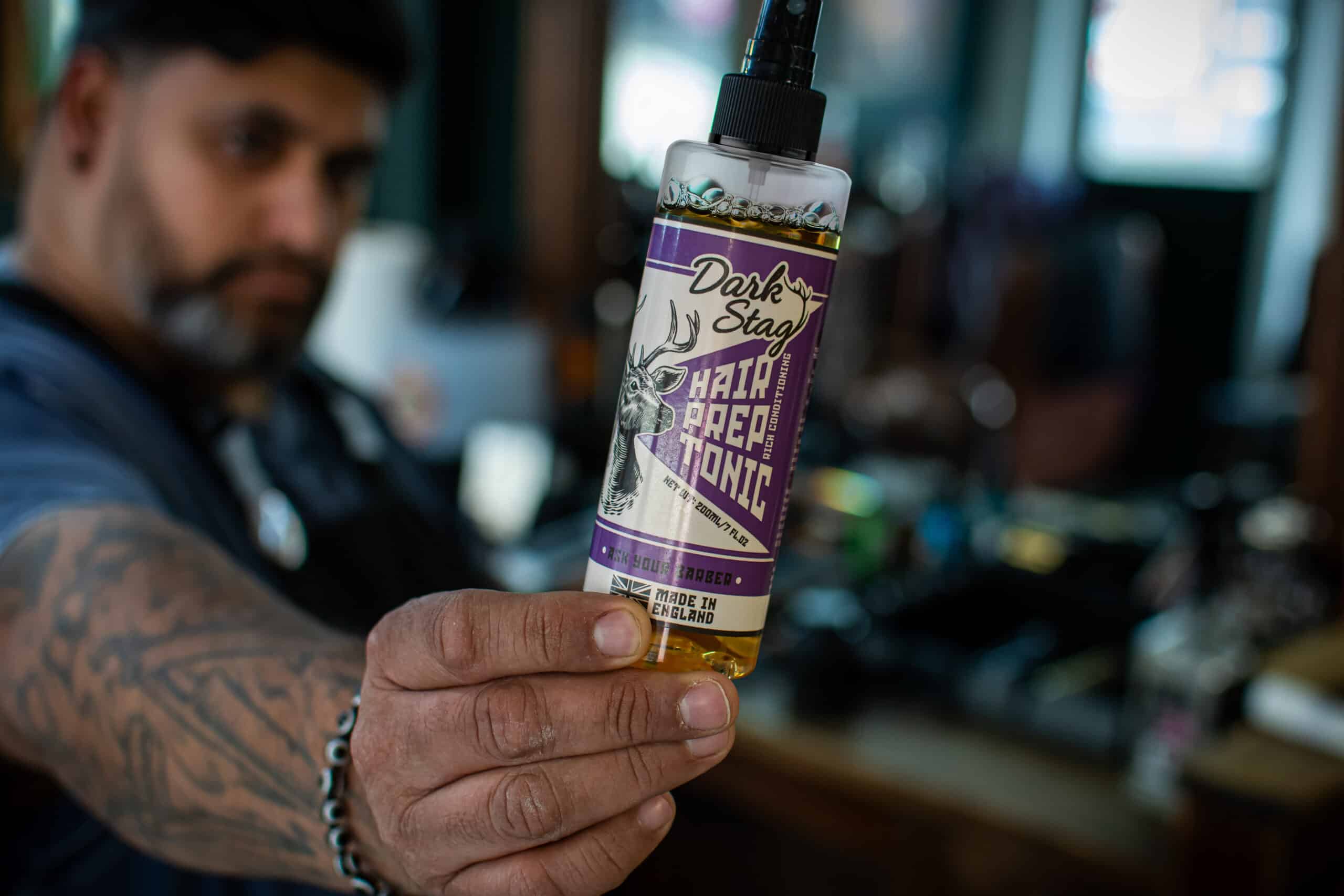 Dark Stag Hair Prep Tonic is expertly formulated to condition hair and improve manageability, ensuring a smoother, more precise cutting process and superior styling results. Its sprayable formula works best on damp hair before cutting or drying, aiding in sectioning and control. Infused with a rich tobacco-inspired scent, it adds a sophisticated aroma to your grooming routine. Suitable for daily use, this 200ml tonic delivers professional-grade performance refined through rigorous barber testing. Elevate your haircut and styling experience with a product designed to meet the demands of expert barbers.